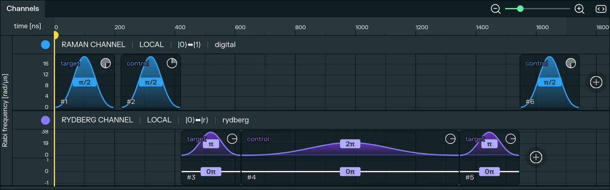 In Pulser Studio, pulses are managed on the Channels panel. It offers a timeline view of the sequence of pulses, as they will be executed by the device, and a visualization of the main characteristics of each pulse, such as waveform, amplitude, phase and detuning.